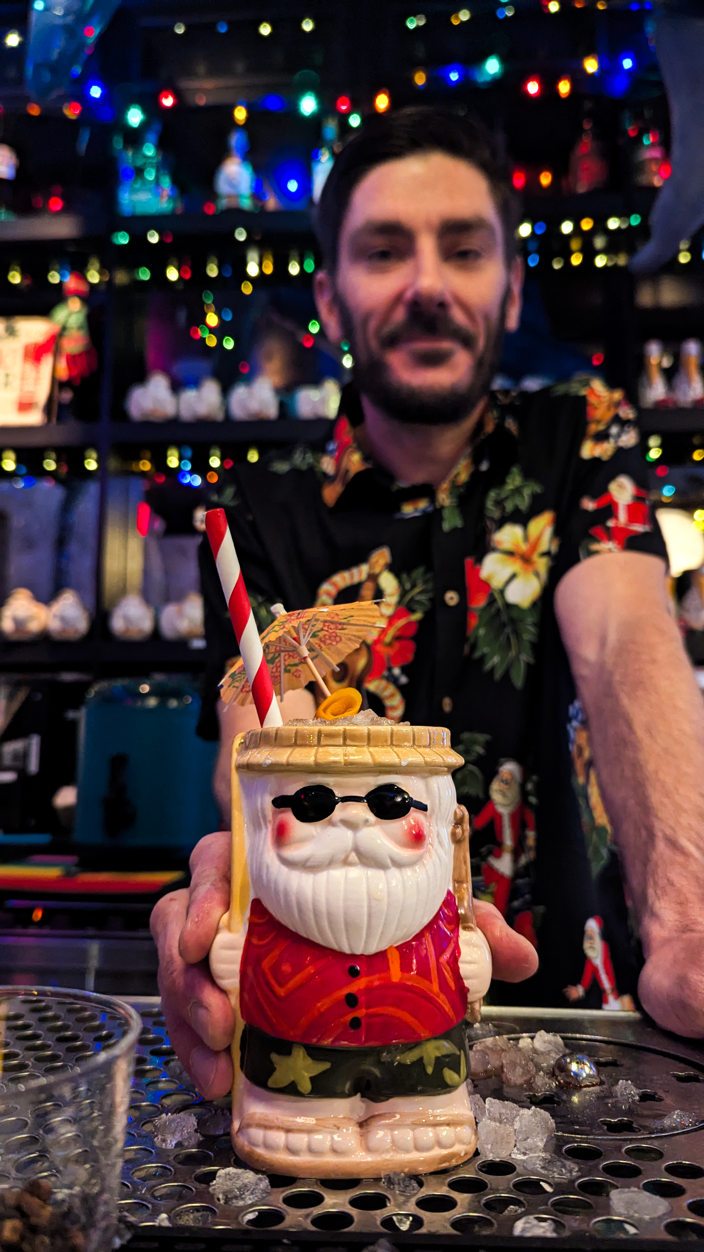 Reservations: are encouraged. Click here to our reservation page. Select your date, and then scroll down to featured events. Select your seating type: Sippin’ Santa Table is a table in our tiki room, Sippin’ Santa Bar is a seat at the Tiki bar, Sippin’ Santa Snow Globe Table is a table in our giant heated outdoor snow globe!